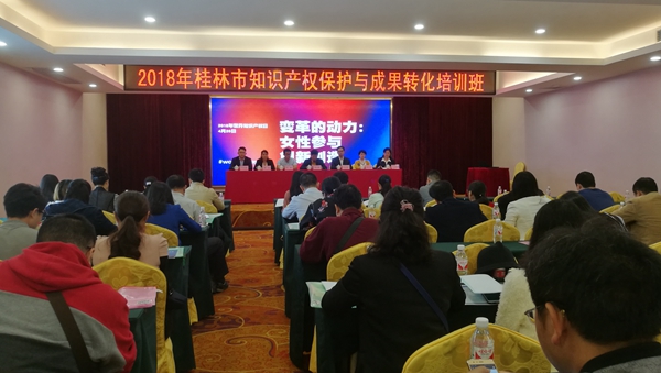 为积极响应“国家知识产权局关于开展2018年全国知识产权宣传周活动的通知”(国知发办字〔2018〕13号)文件精神,贯彻落实《广西发明专利双倍增计划(2016-2020)》和《广西壮族自治区人民政府办公厅关于印发广西科技成果转化大行动实施方案(2015-2020年)的通知》(桂政办发〔2015〕91号),加强知识产权运用保护和科技成果转化对于创新驱动发展、大众创业万众创新的支撑作用,4月24日,市科学技术局(市知识产权局)在桂林临桂大酒店举办了“2018年桂林市知识产权保护与成果转化培训班”,我市企事业单位、大专院校、科研院所、知识产权服务机构、县区科技局等相关人员共130余人参加了此次培训班。